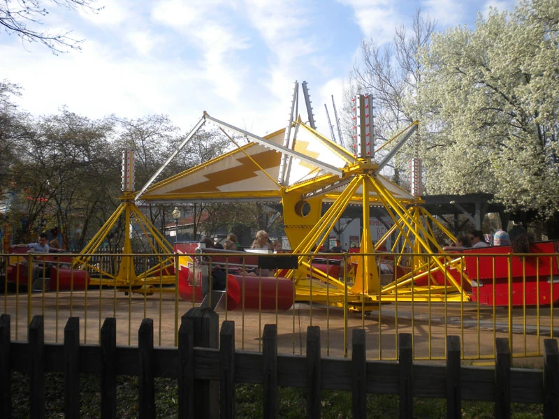 Shazam! is a classic scrambler ride located in the "Shazam Court" area of DC Comics Plaza at Six Flags St. Louis. It is themed after the DC Comics super hero Shazam, and it opened in 1997.